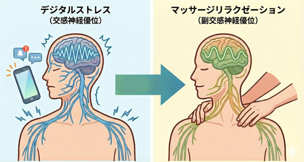 マッサージは、この「戦闘モード」を解除し、体をリラックスさせる「副交感神経優位」の状態へと導く強力なツールです。そのメカニズムを次の図で見てみましょう。