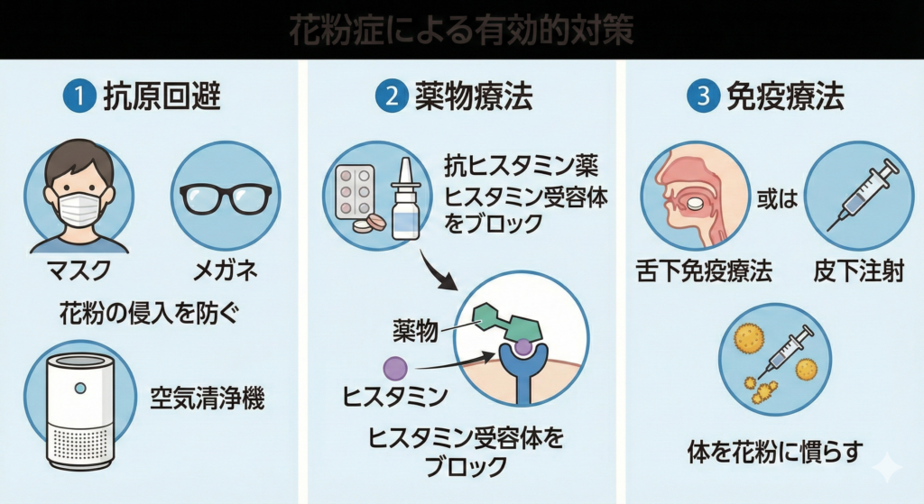 - ① 抗原回避: 最も基本的な対策は、原因となる花粉を体に入れないことです。マスク、メガネの着用、帰宅時の洗顔・うがい、空気清浄機の活用などが有効です。
