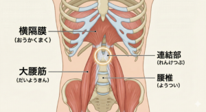 さらに、横隔膜は腰痛と切っても切り離せない重要な筋肉、**「大腰筋」**と解剖学的に密接なつながりを持っています。