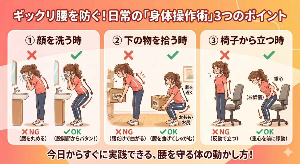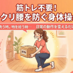 ギックリ腰の予防と聞くと、腹筋や背筋を鍛えるハードなトレーニングを想像しがちですが、もっと大切なのは「腰を痛めない使い方」を体に覚えさせることです。