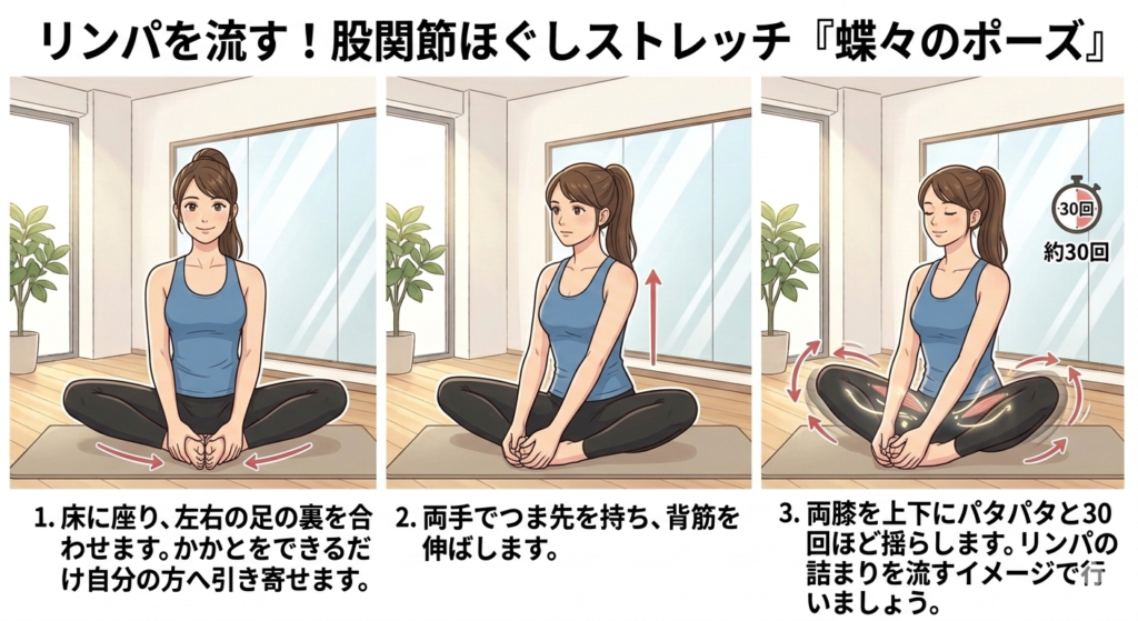 3. 股関節から動かす意識で、両膝を蝶々の羽のように上下にパタパタと30回ほど揺らします。リンパの詰まりを流すイメージで行いましょう。