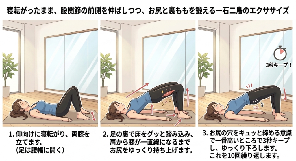 寝転がったまま、股関節の前側を伸ばしつつ、お尻と裏ももを鍛える一石二鳥のエクササイズです。